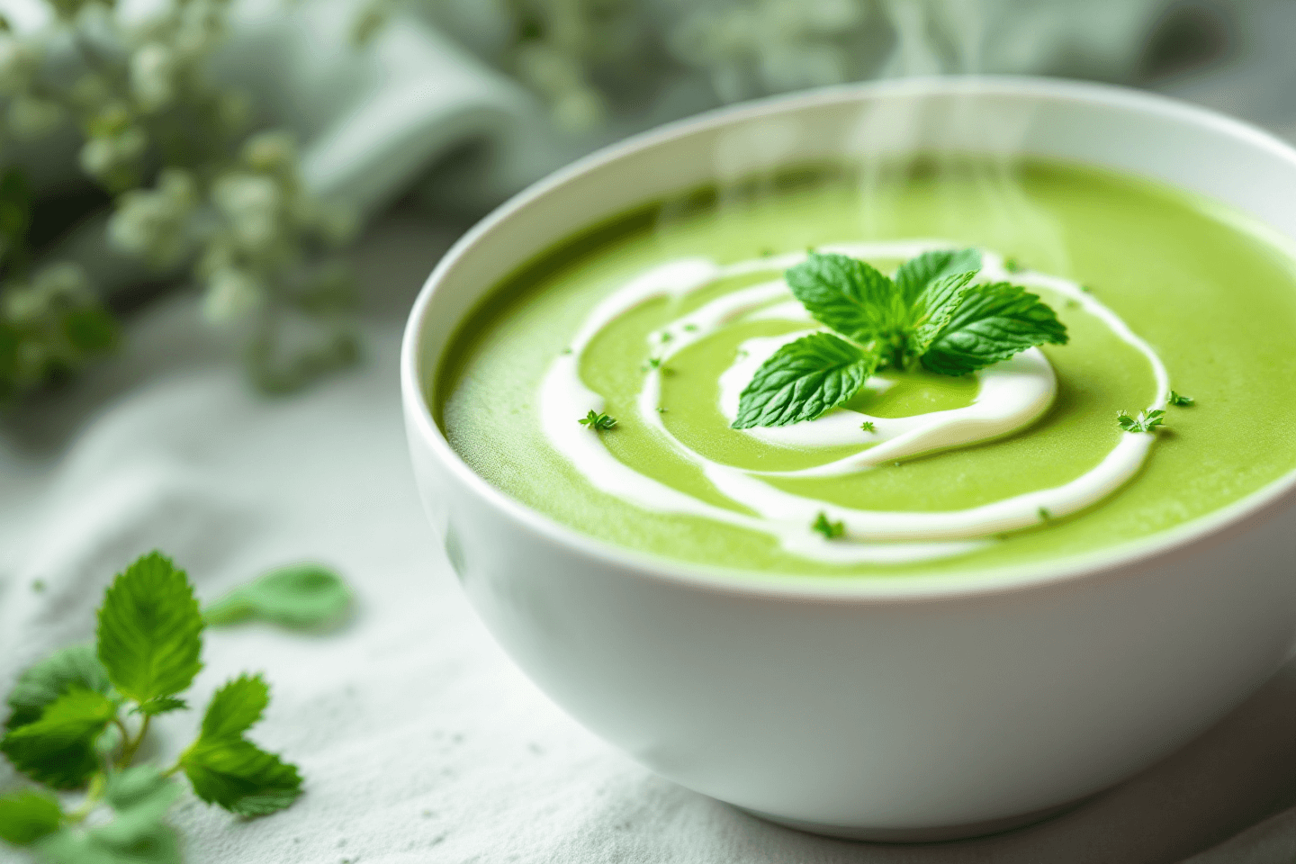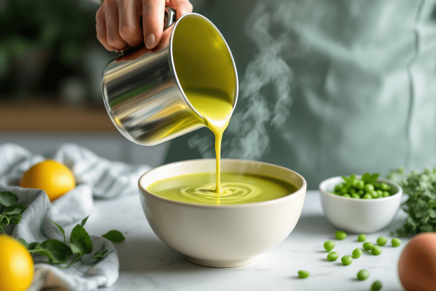 - 완두콩 스프: 데친 완두콩과 감자, 우유, 양파를 믹서에 갈고 끓이면 부드러운 스프 완성