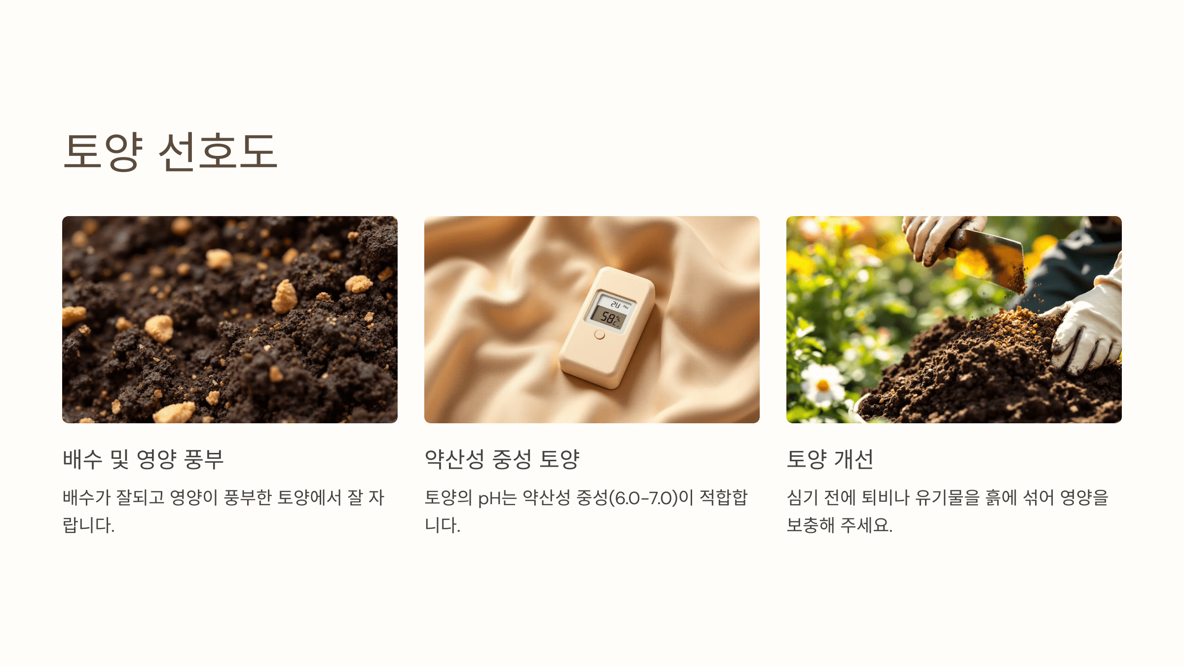 배수가 잘되고 영양이 풍부한 토양에서 잘 자랍니다. 심기 전에 퇴비나 유기물을 흙에 섞어 영양을 보충해 주세요. 토양의 pH는 약산성 중성(6.0~7.0)이 적합합니다.