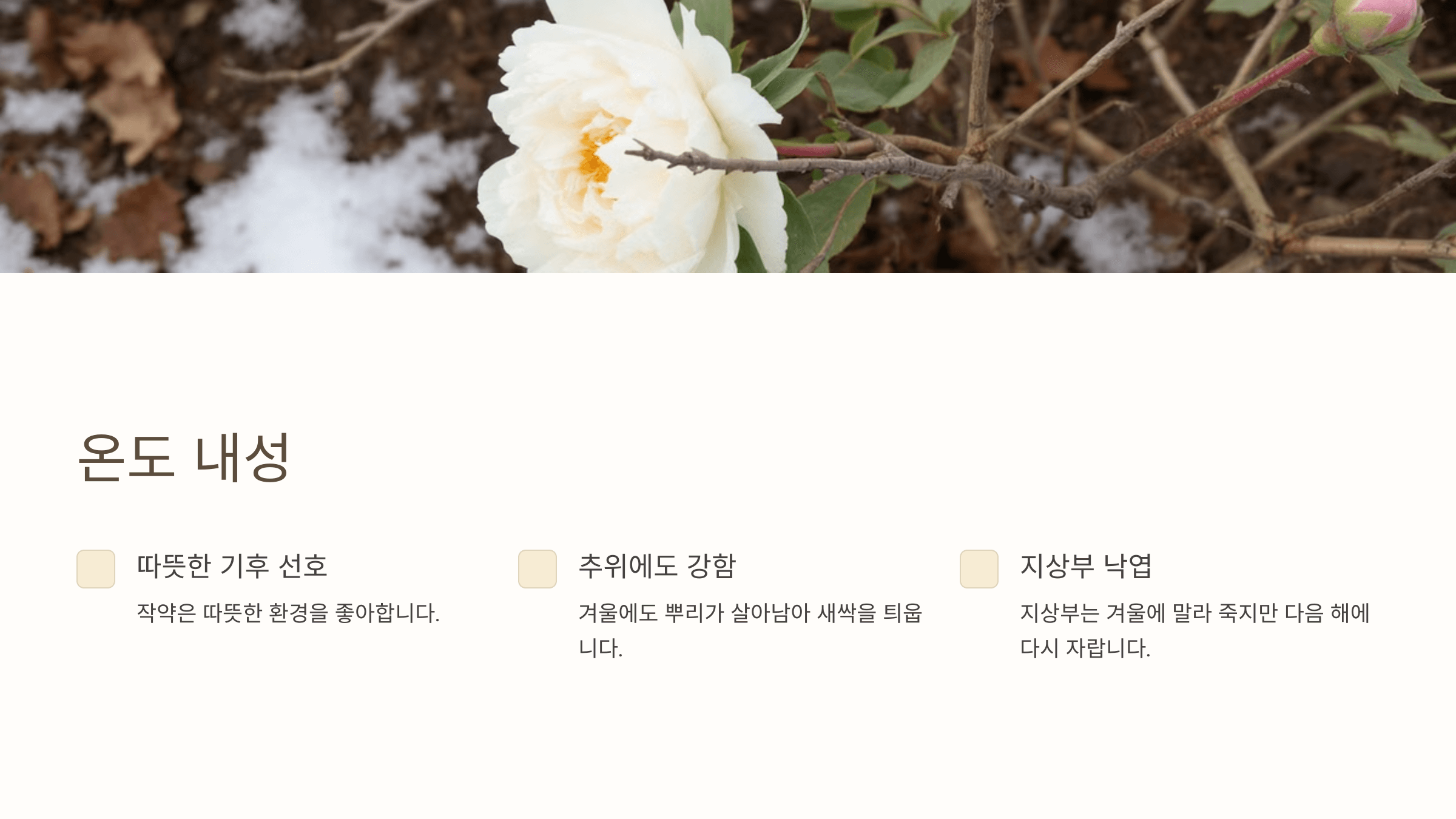 작약은 따뜻한 기후를 좋아하지만, 추위에도 강한 식물입니다. 겨울에도 지상부는 말라죽지만, 뿌리는 살아남아 다음 해에 다시 새싹을 틔웁니다.